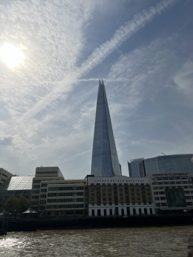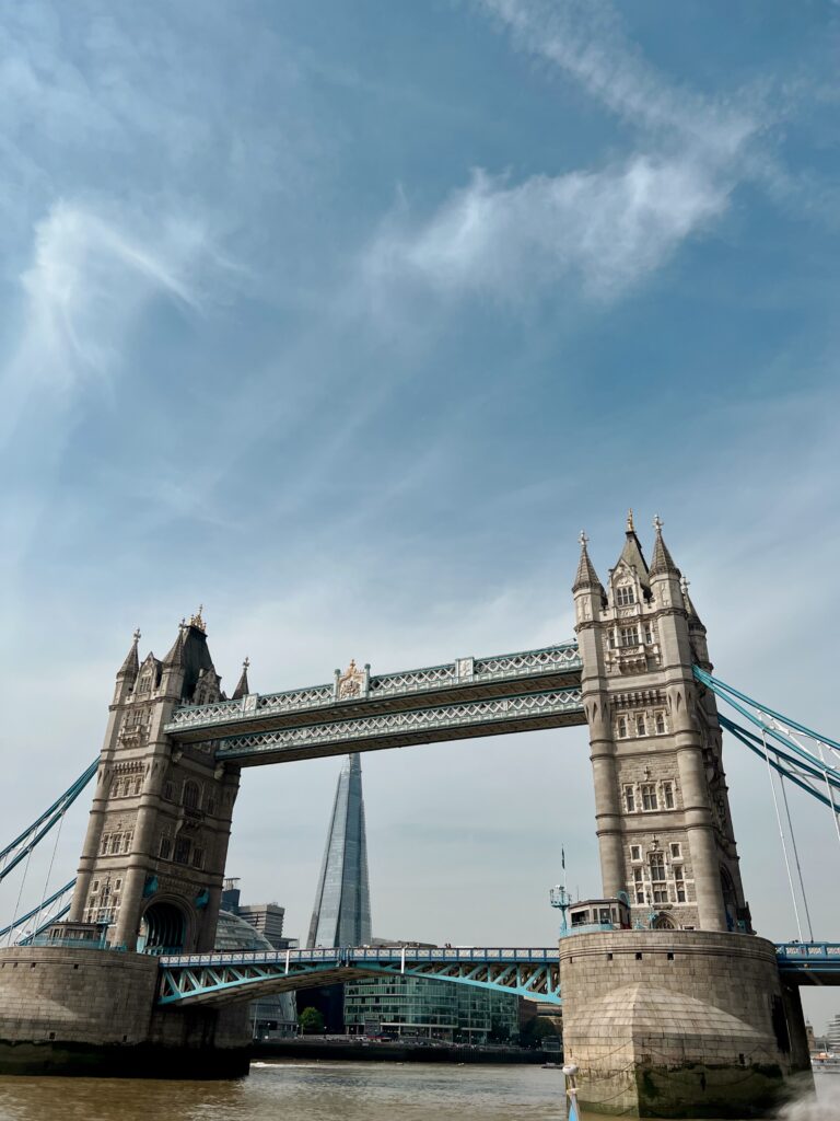 Bridges curved overhead one by one, each holding its own shape and weight. Big Ben catching the light. The Tower of London sitting low and watchful at the water’s edge. The Shard rising sharp and certain beside centuries old stone.