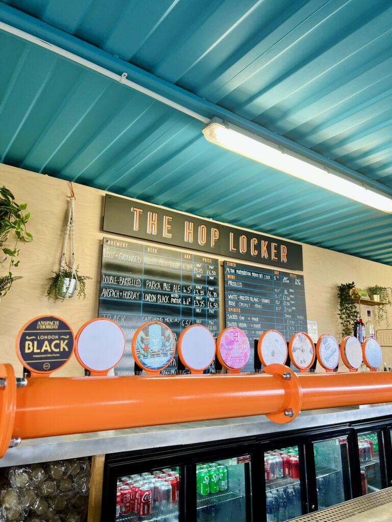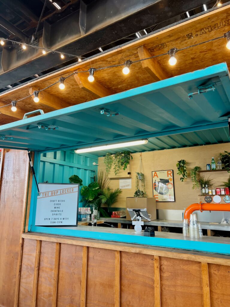 Tucked beneath all that structure was a small burst of color called The Hop Locker. Turquoise walls. Warm wood. String lights glowing even in daylight. A chalkboard menu written in careful rows. It felt temporary and permanent all at once.