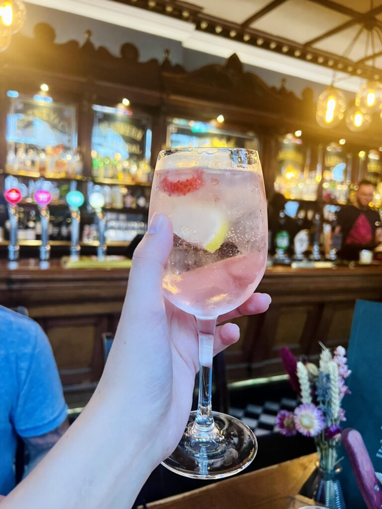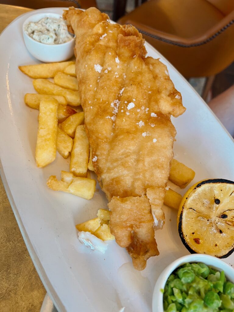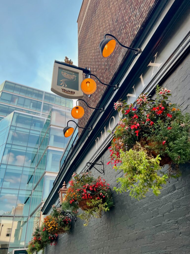 By late afternoon, we found ourselves at The Phoenix, tucked beneath hanging flowers and warm light. Inside, the windows caught the sun just right, turning everything golden. An Aperol spritz for me. Fish and chips crisp and steaming between us. The kind of meal that asks you to slow down.