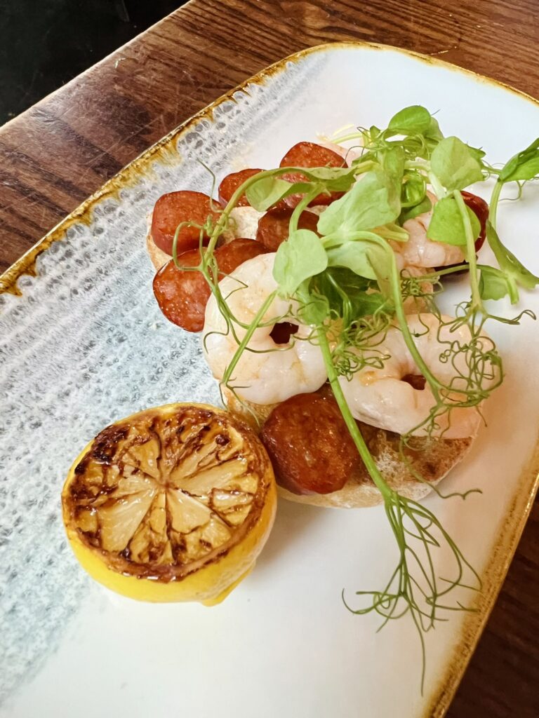We ordered small plates to share. Shrimp layered over toasted bread. Chorizo rich and warm. A slice of lemon charred just enough to release its scent. I held a spritz chilled and bright in my hand. Nick nursed a cask beer, slow and content.