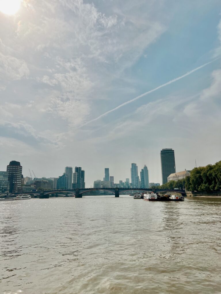 The hum of traffic faded into the distance. The movement of the boat slowed the day down. The Thames carried us forward, brown and steady and older than anything rising along its banks.