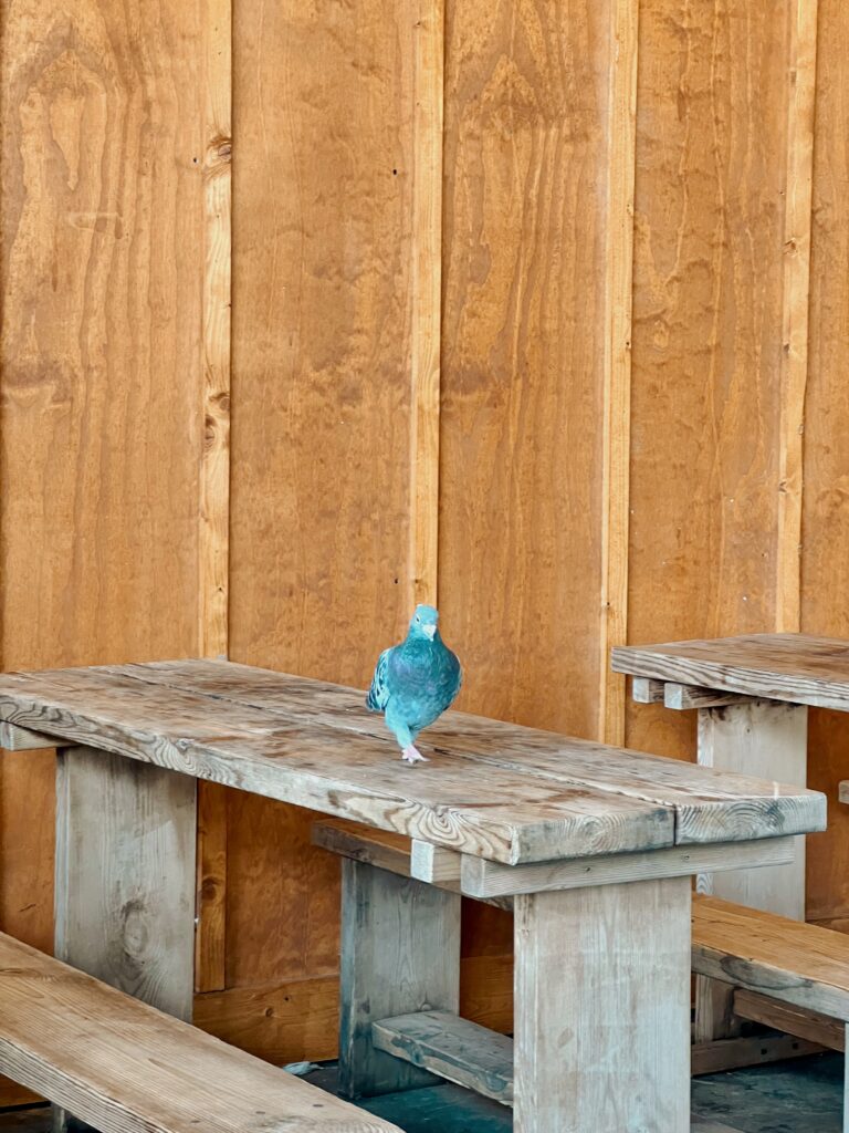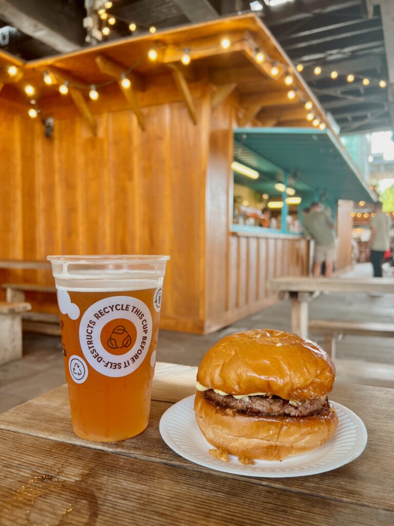 We ordered cold beers and carried them to a picnic table beneath the beams. Burgers and fries from Truffle Burger arrived in paper trays, simple and exactly what we needed. The bun soft. The salt lingering on our fingers. The kind of food that tastes better because you have walked all morning.
