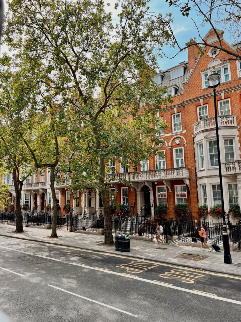 By the time we reached Bloomsbury, the day had finally slowed its pulse. Rows of brick townhouses lined the streets, black iron railings framing narrow steps. Trees stretched gently overhead. The air felt different there. Less hurried. Lived in rather than performed.