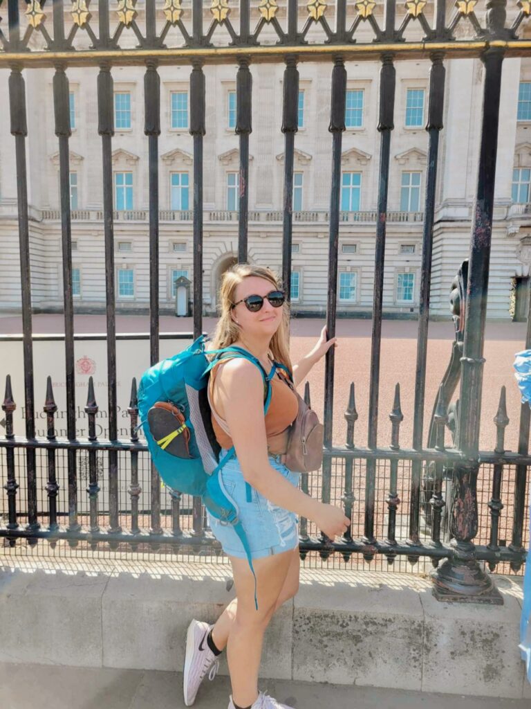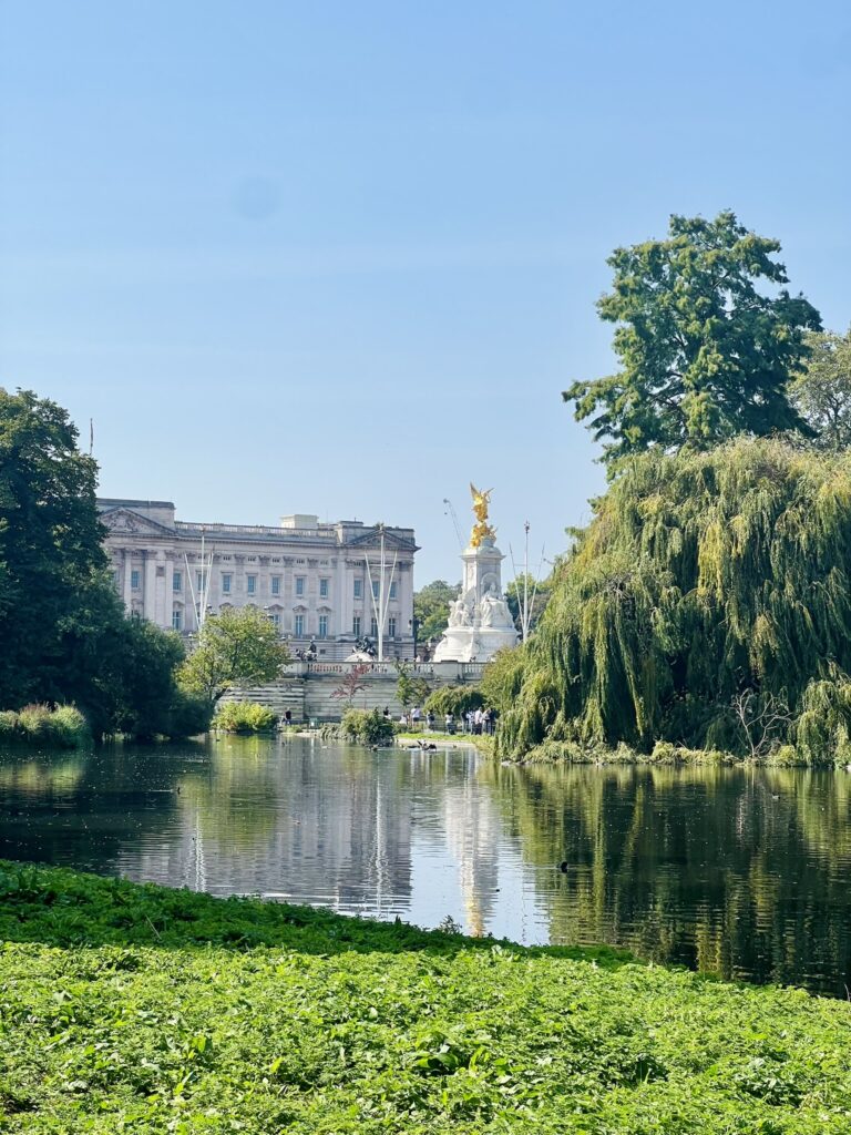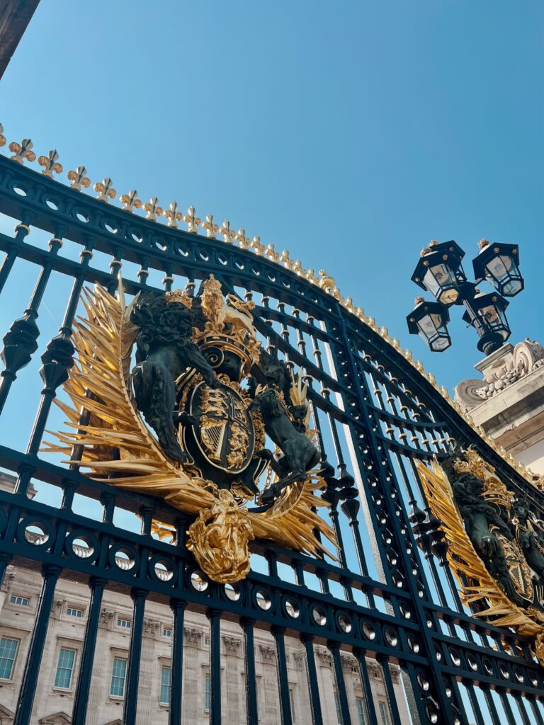 Buckingham Palace emerged in symmetry and sunlight, its gates detailed and bright. Crowds gathered along the railings. Cameras lifted. Guards stood impossibly still in red against the pale stone.