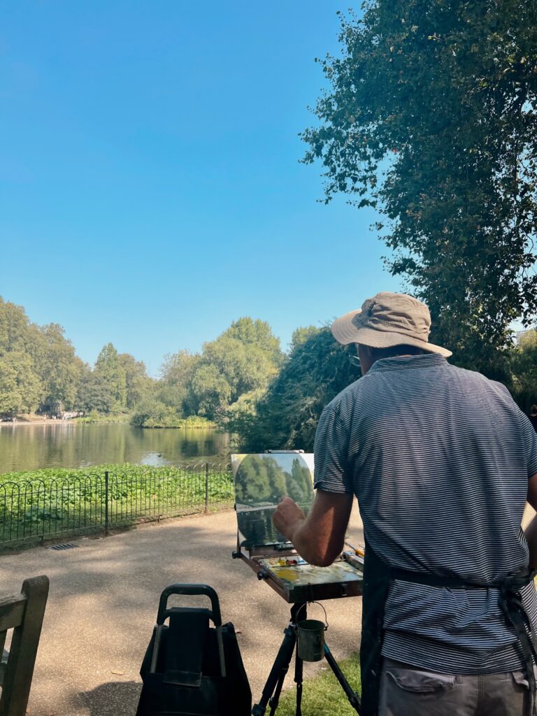 The path curved beside still water, sunlight flickering through leaves overhead. Willows brushed the surface gently. A swan moved slowly along the edge, unbothered by the quiet audience watching from the bank. Ducks drifted in lazy lines. Somewhere nearby, an artist stood at his easel, painting the same scene we were walking through.