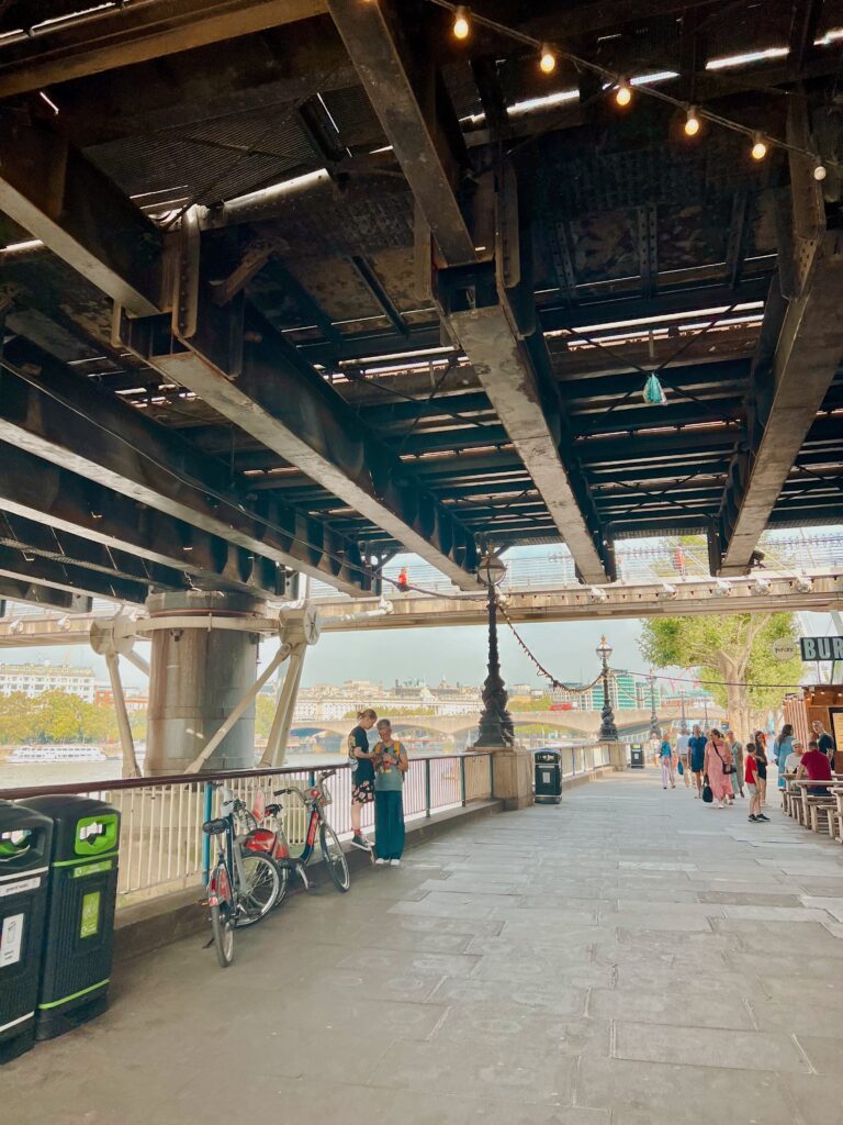We followed the river path beneath the steel ribs of the bridges, the air shifting cooler in the shade. Footsteps echoed overhead. Cyclists passed. The Thames moved quietly beside us as if nothing in the city could rush it.